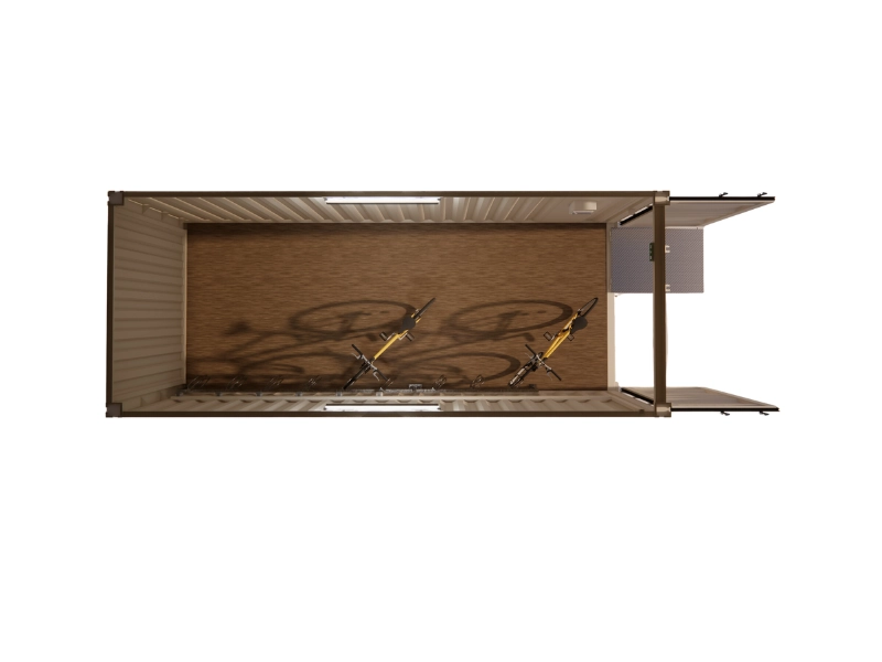 Abri vélo 6 places en container maritime premier voyage 20 pieds. Eclairage et prises de recharges individuelles. Rampe d’accès repliable antidérapante. Portes verrouillables par cadenas protégé par un boitier anti-effraction. Emprise au sol 14,8 m². Sol alu strié. 7 546 € TTC