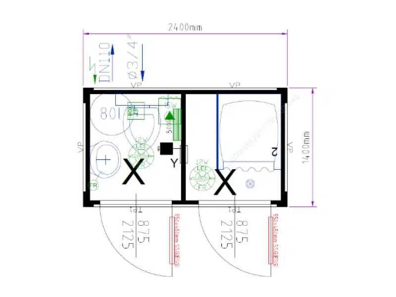 2 portes | 2 fenêtres | 2 plafonniers LED 12W | 1 prise électrique | Chauffage convecteur électrique 500W | Extracteur d’air 170 m³