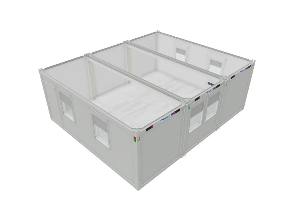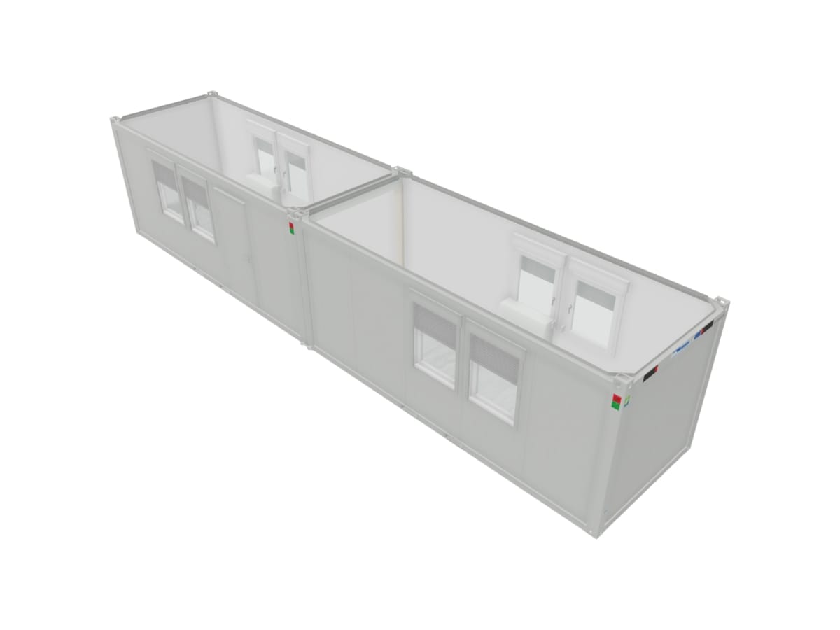 Bungalow offrant 29,4 m² (12,15 m x 2,44 m). Isolation laine de verre (100 mm en toiture, 60 mm au sol) et mousse PU (60 mm aux murs). 8 fenêtres oscillo-battante. 1 porte ouvrant sur l’extérieur. 4 rampes d’éclairage LED. 4 prises électriques doubles. PAC réversible 3,1 kW.  Décor intérieur blanc, revêtement de sol gris. Marquage CE et conformes aux normes incendie. Disponible sur commande.