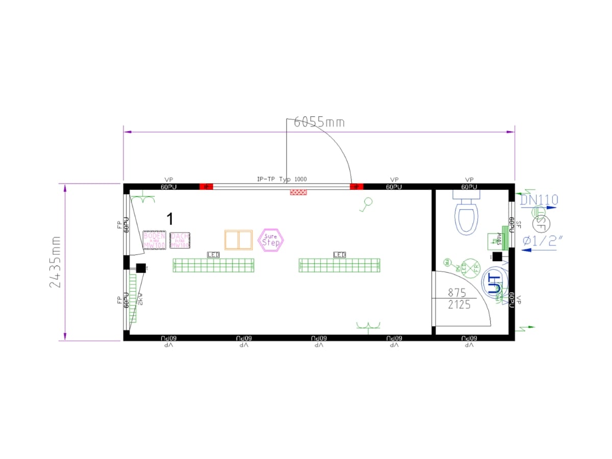 Bungalow de 14,7 m² (6,06 m x 2,44 m) doté d’une zone bureau et d’un WC séparé en accès intérieur. Isolation laine de verre (60 mm au sol et 100 mm en toiture) et PU (60 mm aux murs). Portes vitrées. 2 fenêtres avec rideaux enroulable et 1 vasistas. Eclairages LED. Prises électriques. Chauffage convecteurs électriques. Décor intérieur blanc, revêtement de sol gris. Marquage CE et conformes aux normes incendie. Disponible sur commande. 10 703 € TTC