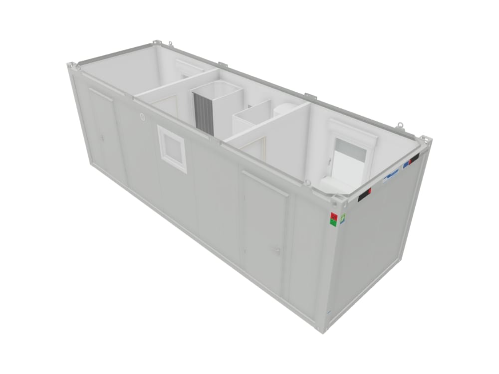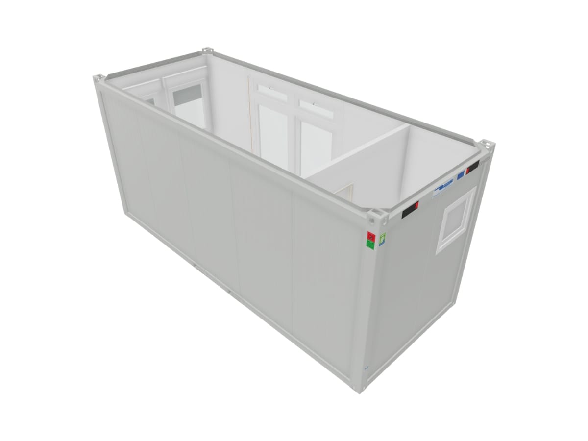 Bungalow dortoir doté de 2 chambres de 5,4 m² et d’une salle de bain partagée équipée d’une douche, d’un lavabo et d’un WC. Module de 24 pieds de 17,9 m² (7,33 x 2,44 m). Entièrement isolé avec climatisation réversible et chauffage dans la salle de bain, eau chaude (ballon de 80L), éclairage et prises électriques. 2 fenêtres avec volet roulant, 1 porte ouvrant sur l’extérieur, 2 portes intérieures. Décor intérieur blanc, sol PVC antidérapant. Marquage CE et conforme aux normes incendie. Disponible sur commande. 16 324 € TTC