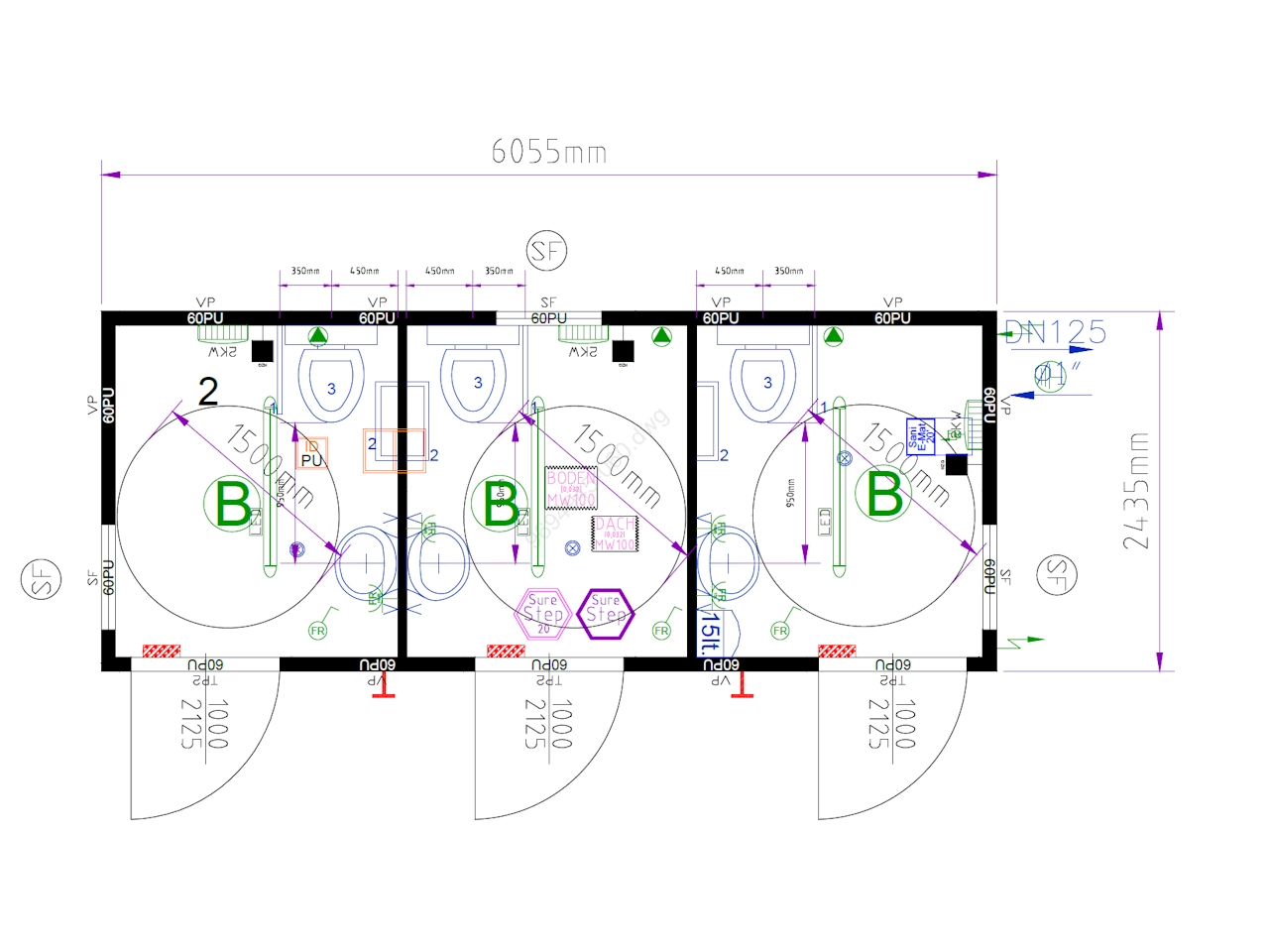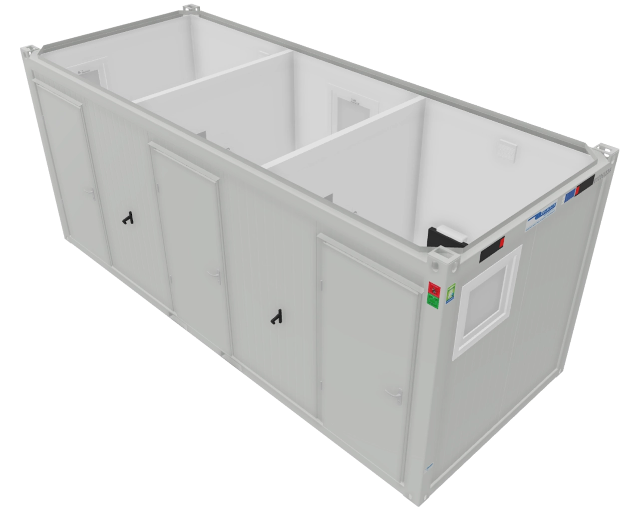 Bungalow offrant 3 cabines WC toutes accessibles aux personnes à mobilité réduite dans un module de 20 pieds de 14,7 m² (6,05 x 2,44 m). Entièrement isolé avec chauffage, eau chaude, éclairage et prises électrique. 3 fenêtres. 3 portes ouvrant sur l’extérieur. Décor intérieur blanc, sol PVC antidérapant. Marquage CE et conforme aux normes incendie. Disponible sous 8 à 10 semaines. 15 015 € TTC