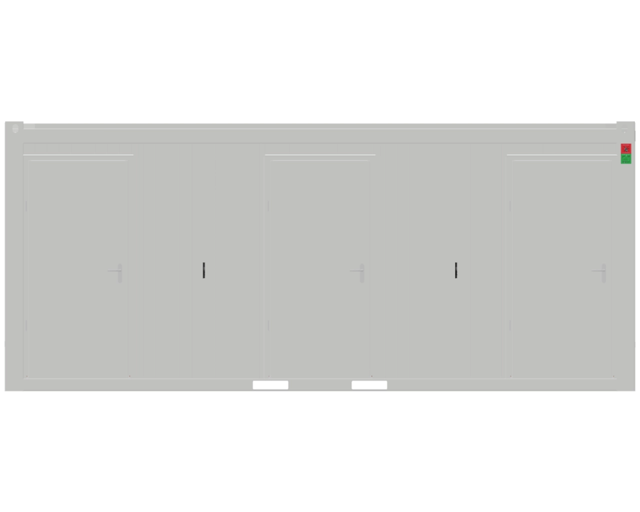 3 portes extérieures (passage libre 93,6 cm) équipées de groom et buttoir | 3 fenêtres | 3 luminaires LED 36W | 4 prises électriques | 3 interrupteurs | 3 détecteurs de mouvement | 3 radiateurs soufflants 2 kW | 3 extracteurs d’air 170 m³ | 3 siphons de sol