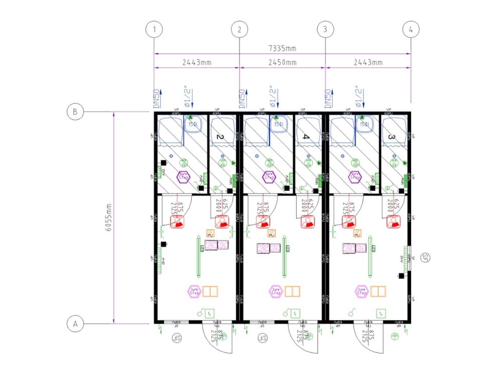 Ensemble modulaire offrant 3 vestiaires séparés comprenant chacun un espace de change dédié et 2 douches. Assemblage de 3 module de 20 pieds sur 44,4 m². Entièrement isolé avec chauffage électrique, eau chaude (ballons de 150L), éclairage et prises électrique. 3 portes ouvrant sur l’extérieur. 2 fenêtres vasistas. Décor intérieur blanc, sol PVC antidérapant. Marquage CE et conforme aux normes incendie. Disponible sous 8 à 10 semaines. 33 110 € TTC
