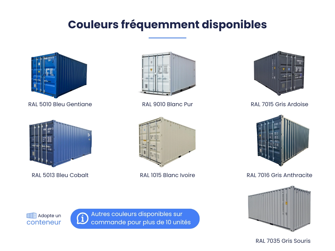 Un seul accès à l’extrémité par porte double. Transport et déchargement en supplément selon destination. Couleur selon arrivage (pas de choix possible).