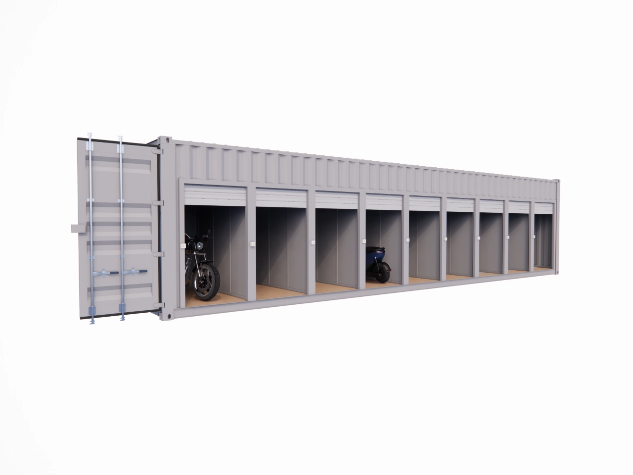 Container maritime 20 pieds Dry premier voyage aménagé en garage de 4 box de 3,4 m² chacun. Equipé de 4 portes rideau enroulable à ouverture manuelle en acier peint. Idéal pou garages moto ou vélo. 9 933 € TTC