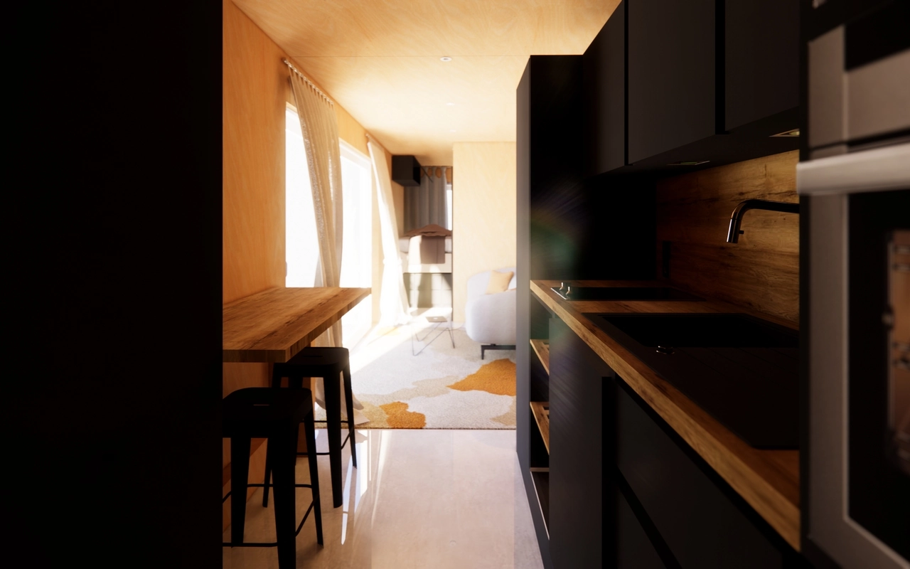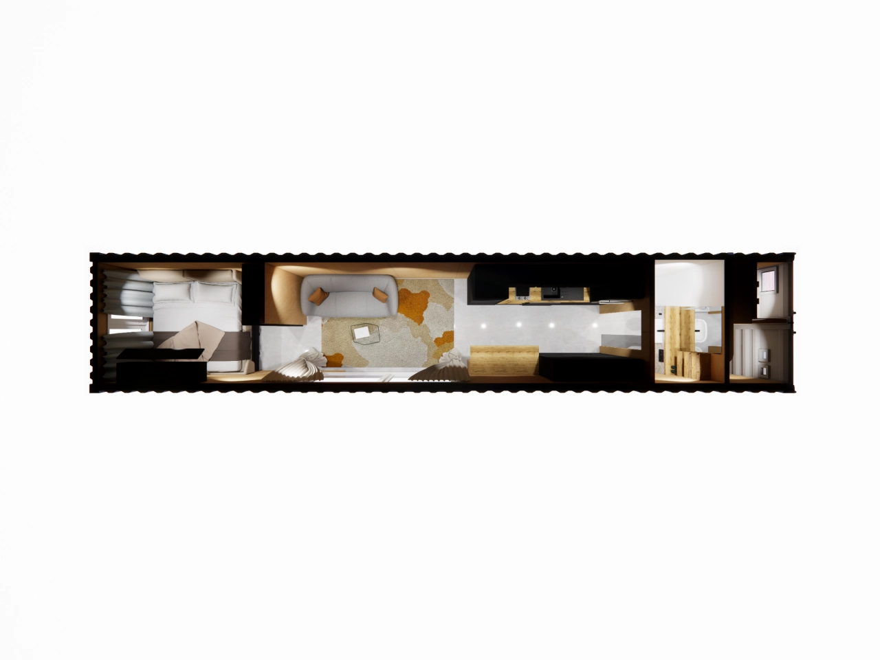 Container maritime 40 pieds transformé en un lieu de vie fonctionnel et confortable. Esthétique avec son bardage sans entretien imitation bois . Espace de vie de presque 23 m² idéal pour une personne seule ou un couple. Entièrement meublé, avec de nombreux rangements. Cuisine sur-mesure et équipée. Salle de bain avec douche, meuble vasque, WC. Confort toute l’année grâce à une PAC réversible. Isolation par l’intérieur performante. Installation rapide. 37 537 € TTC