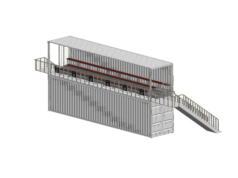 Tribune offrant une belle vue aux spectateur sur le terrain ou pour des événements. Facilement déplaçable en grutage avec les coins iso du container ou avec engin muni de fourches (container muni de passages de fourches).