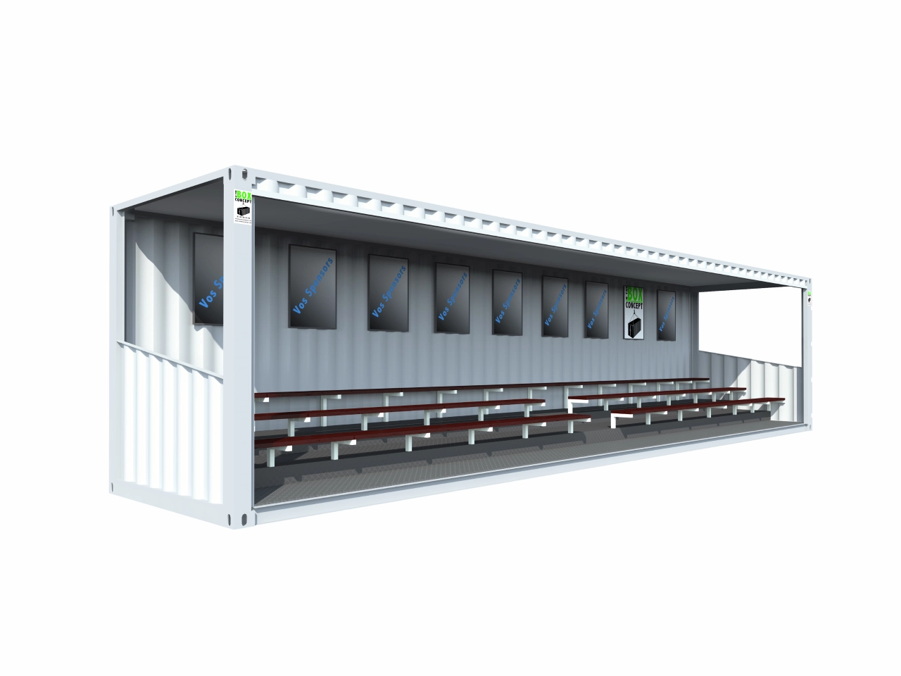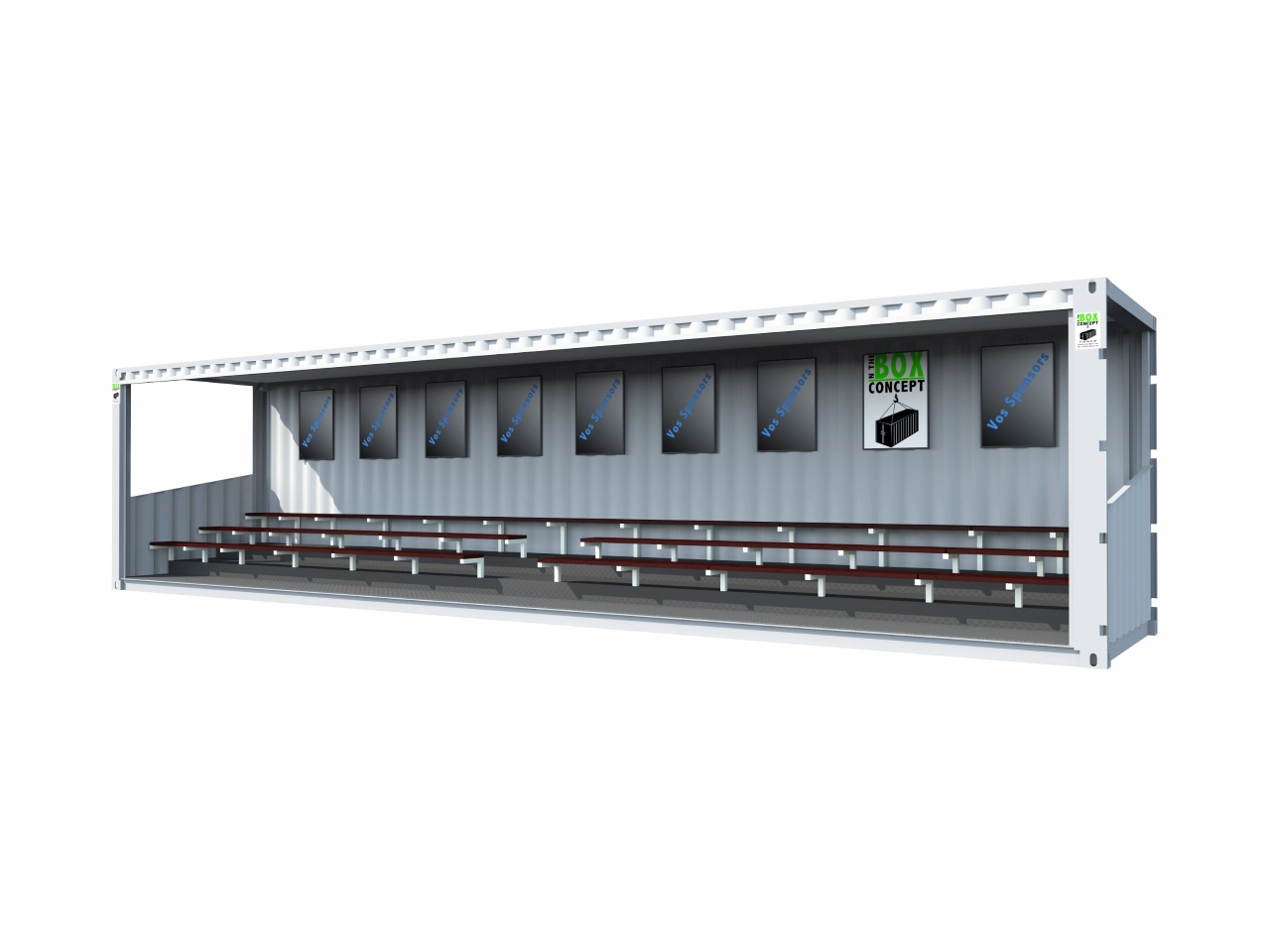 Tribune offrant une belle vue aux spectateur sur le terrain ou pour des événements. Facilement déplaçable en grutage avec les coins iso du container.