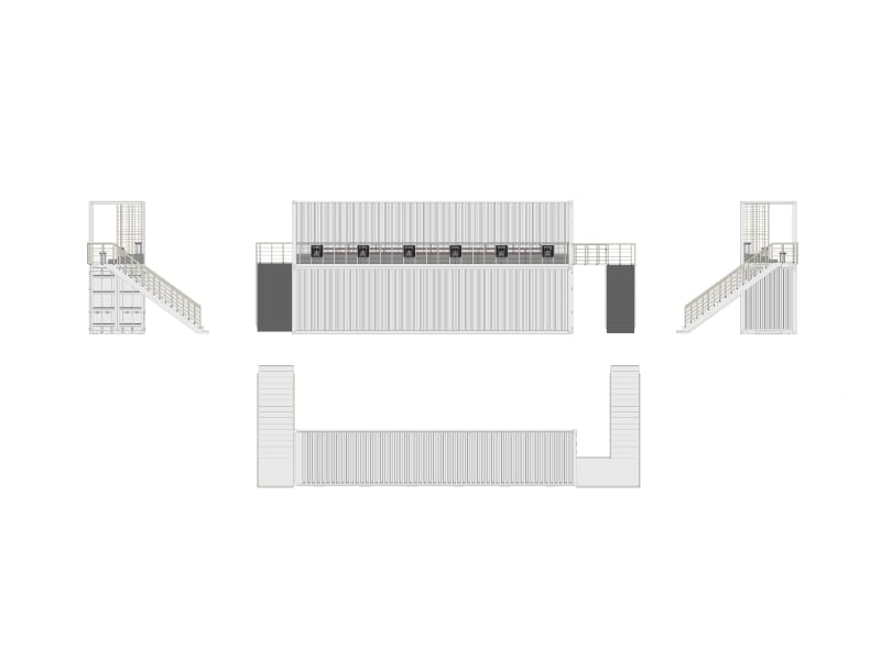 Base : Container maritime 40 pieds high cube dernier voyage. Structure, parois et portes en acier Corten. Intégrité structurelle et étanchéité garanties. Plancher bois marine de 28 mm d’épaisseur.